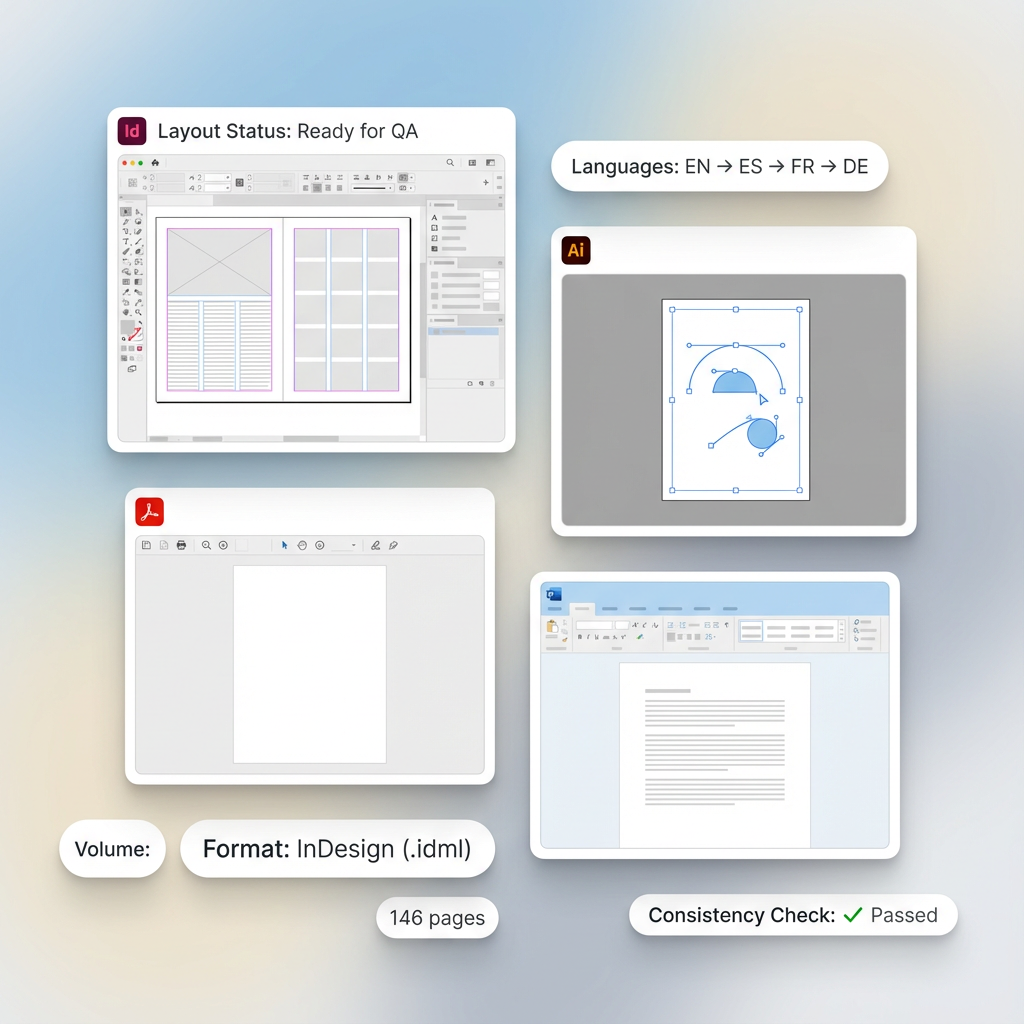 Advanced Desktop Publishing for multilingual content, ensuring structural integrity, CAT-friendly formatting, and precision across demanding production environments.