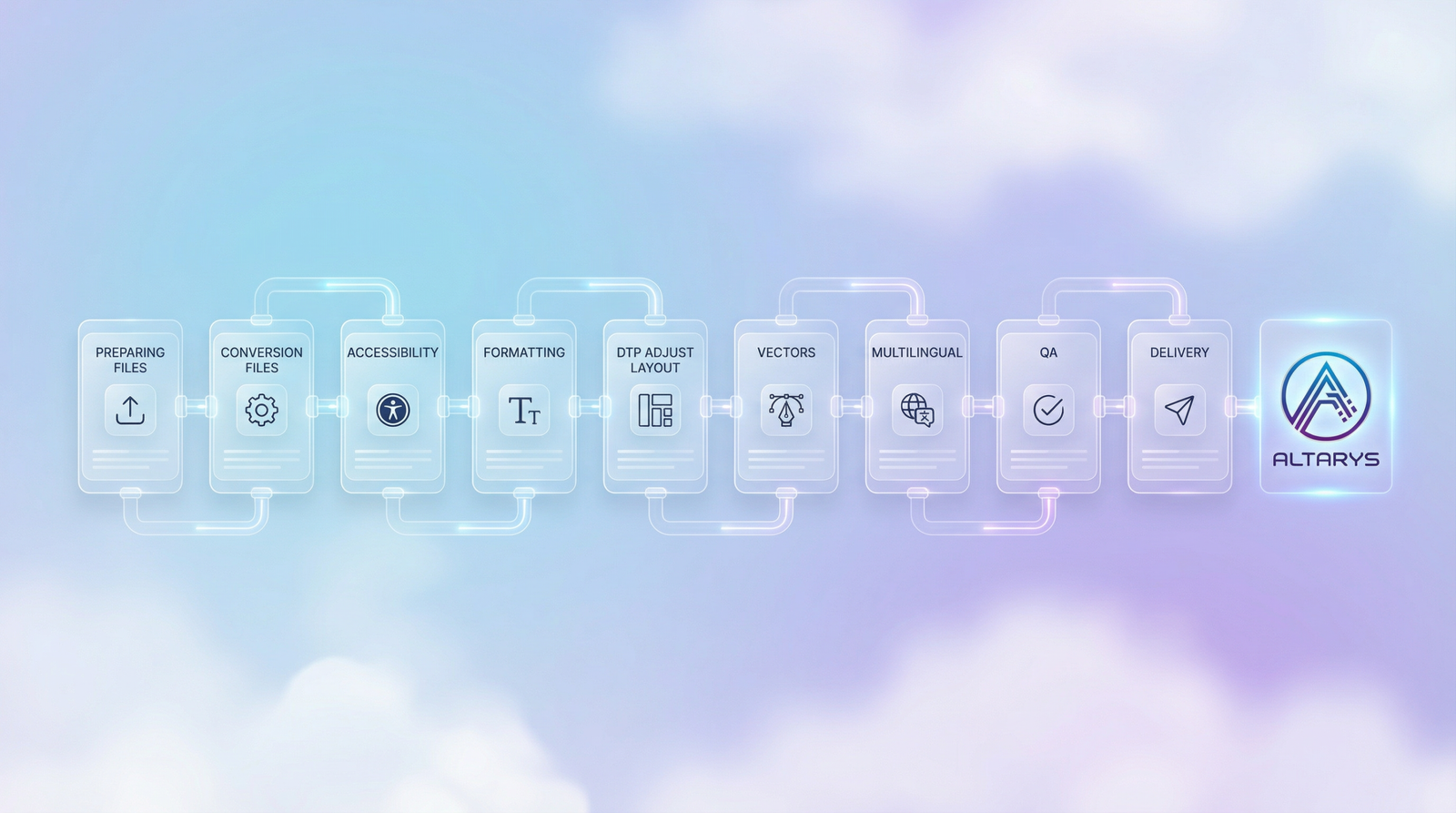 We manage the full DTP process: formatting, layout, vectors, multilingual content, and final QA
